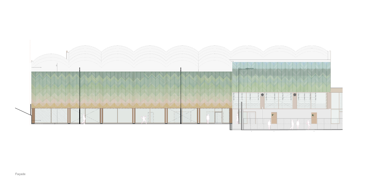 Un motif très léger, proposé par Magali Poutoux, artiste plasticienne, est sérigraphié. Il offre une texture à la façade qui créé un moirage avec les branches, les feuilles et leurs ombres portées. La gradation de couleurs permet de fondre les façades dans les différentes strates du parc : la terre, les troncs, le feuillage, le ciel.