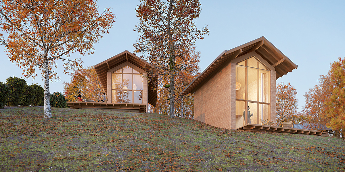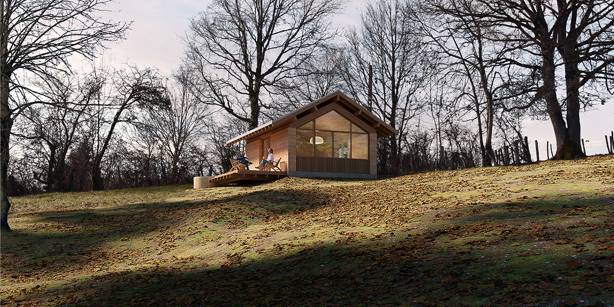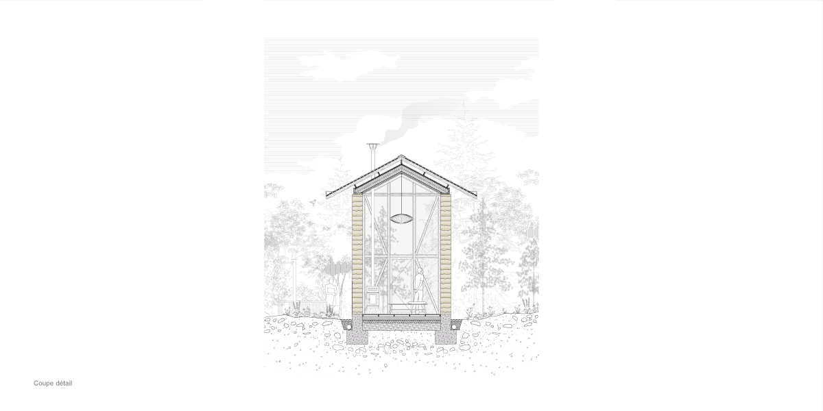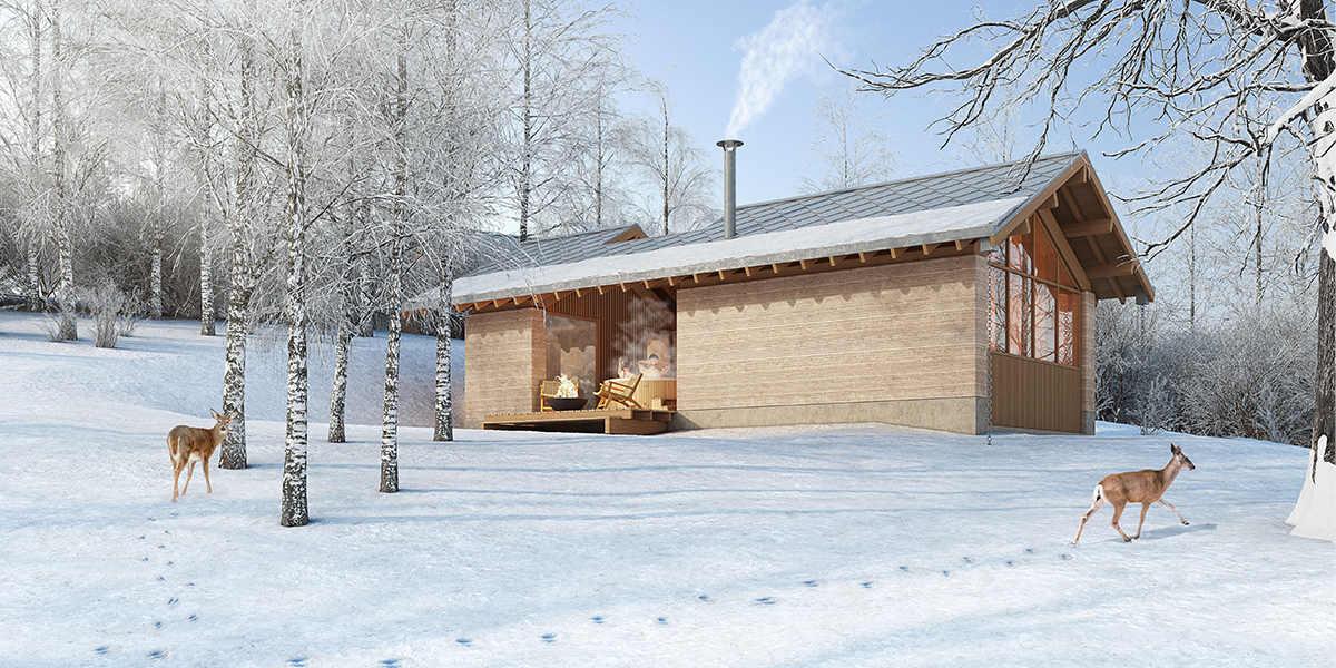 programme Hébergement touristique comprenant une cabane d’accueil (accueil du public, stockage, espace laverie) 4 cabanes types gîtes (salon, salle de bain, chambre, terrasse, bain nordique sauna)