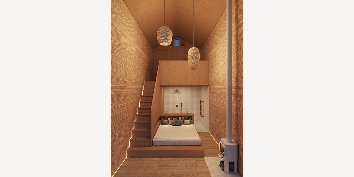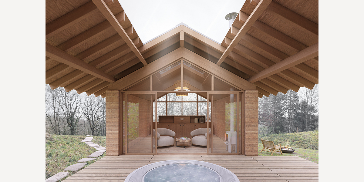 L’organisation du site privilégie la simplicité ainsi que le respect de la faune et de la flore locale. Chaque cabane, inspirée d’un élément naturel (Feu, Air, Eau, Terre), s’ouvre sur des perspectives distinctes : vers le village et son clocher, vers la vallée boisée, ou vers des vues plus intimistes, protégées par la végétation. Les ambiances intérieures des cabanes sont pensées pour offrir un confort optimal et une connexion intime avec la nature. Les murs en terre crue, grâce à leurs propriétés d’isolation naturelle, régulent l’air et l’hygrométrie, créant ainsi un environnement sain et agréable. Les planchers et le plafond en bois apportent une chaleur douce et naturelle, renforçant l’atmosphère cocooning des lieux. Le mobilier en bois, conçu sur mesure, s’intègre parfaitement aux espaces tout en préservant les vues cadrées. Chaque cabane dispose également d’une terrasse avec un bain nordique, invitant à la contemplation du paysage dans un cadre apaisant.
