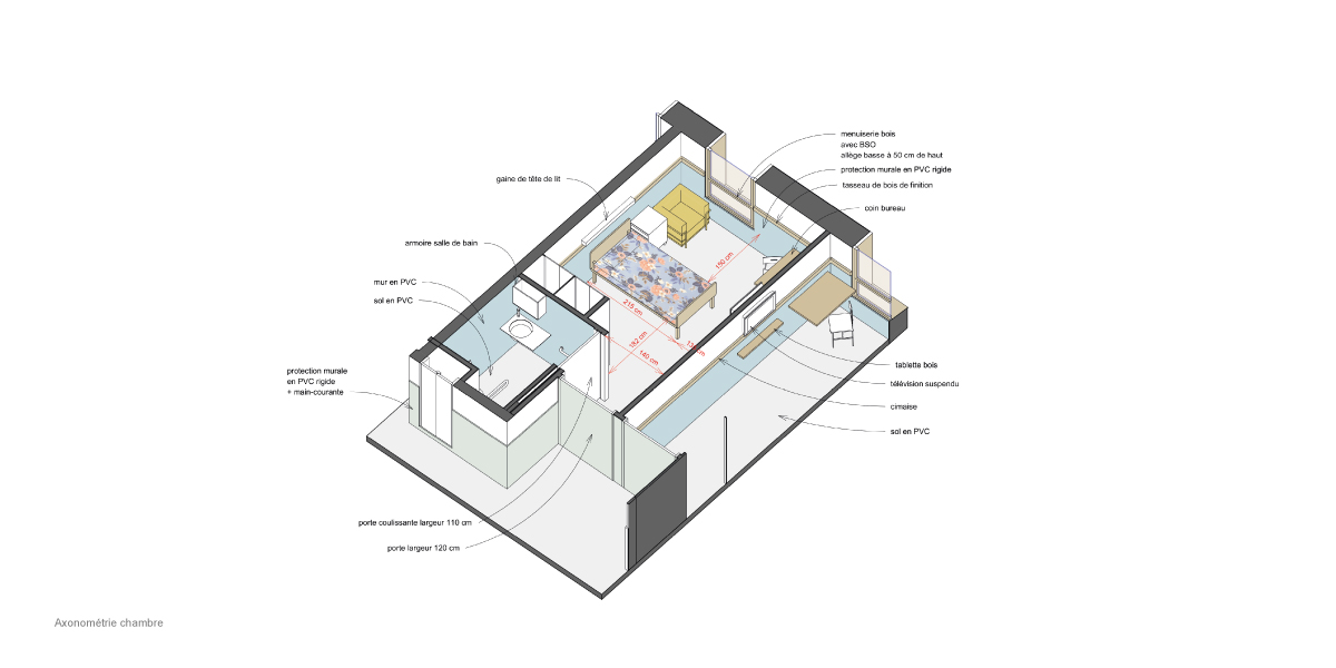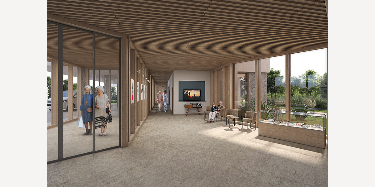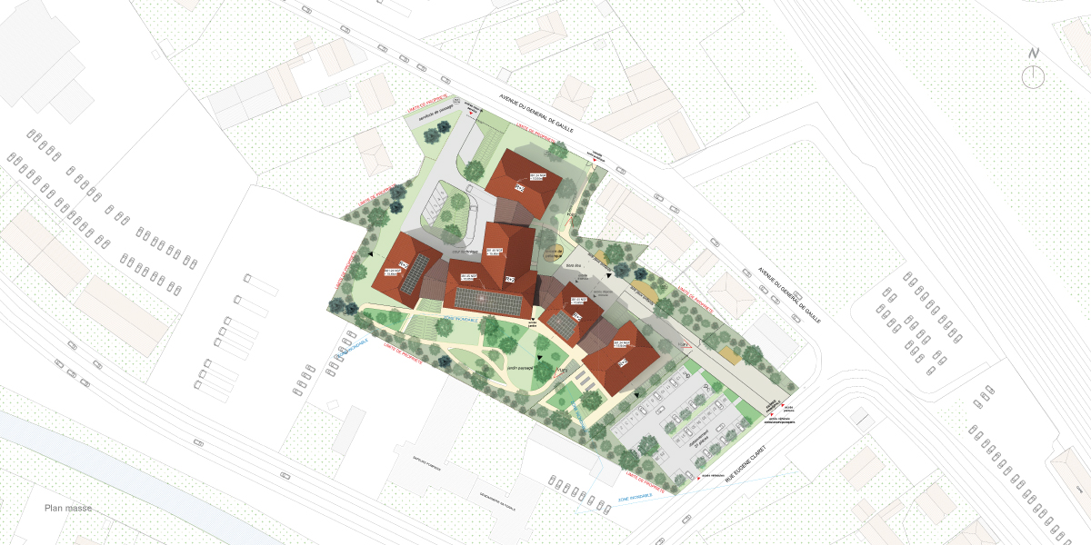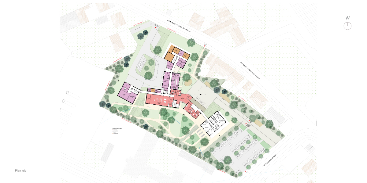 En RDC, les fonctions sont en lien avec le grand jardin paysagé au sud, largement arborés, tandis qu’au nord prend place une venelle publique accessible aux riverains comme aux habitants de l’EHPAD qui vient recréer de la vie en cœur d’îlot. Enfin, à l’ouest prend place une cour technique indépendante pour gérer facilement les flux logistiques et techniques.