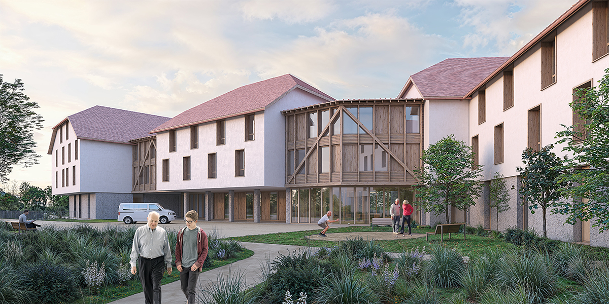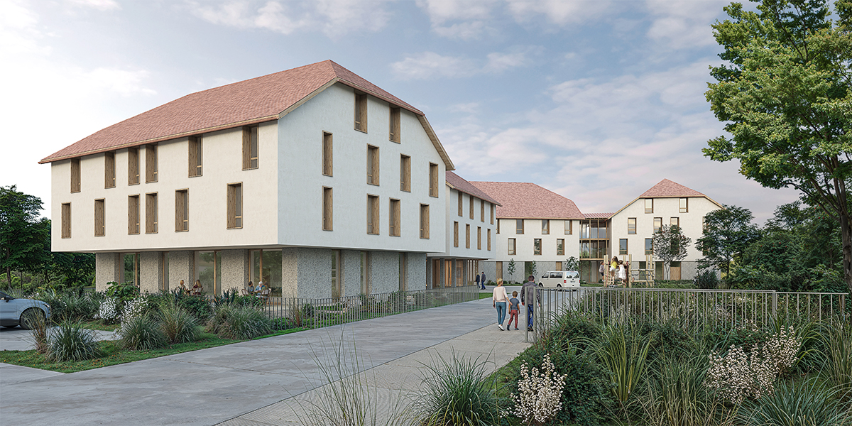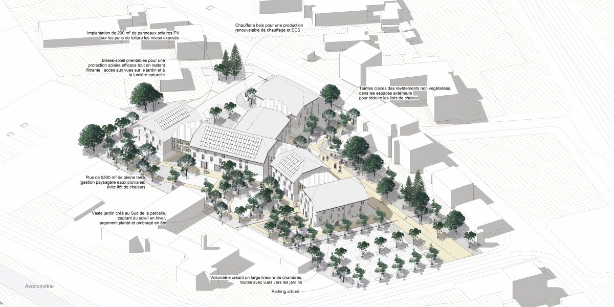 Dans l’ancien lit de la rivière Allaine voisine, le site de projet est caractérisé par des remblais qui nivellent la topographie en un plateau homogène sans grande qualité. Le projet architectural tend à recréer ce lien à la rivière en proposant une architecture de socle en RDC composé en béton sablé qui rappelle le caractère alluvionnaire du site. Ce socle est surmonté de maisonnées accueillant les chambres dans les étages. Les maisonnées sont reliées entre elles par des volumes de liaisons largement vitrés et bardés de bois qui regroupent les espaces communs.