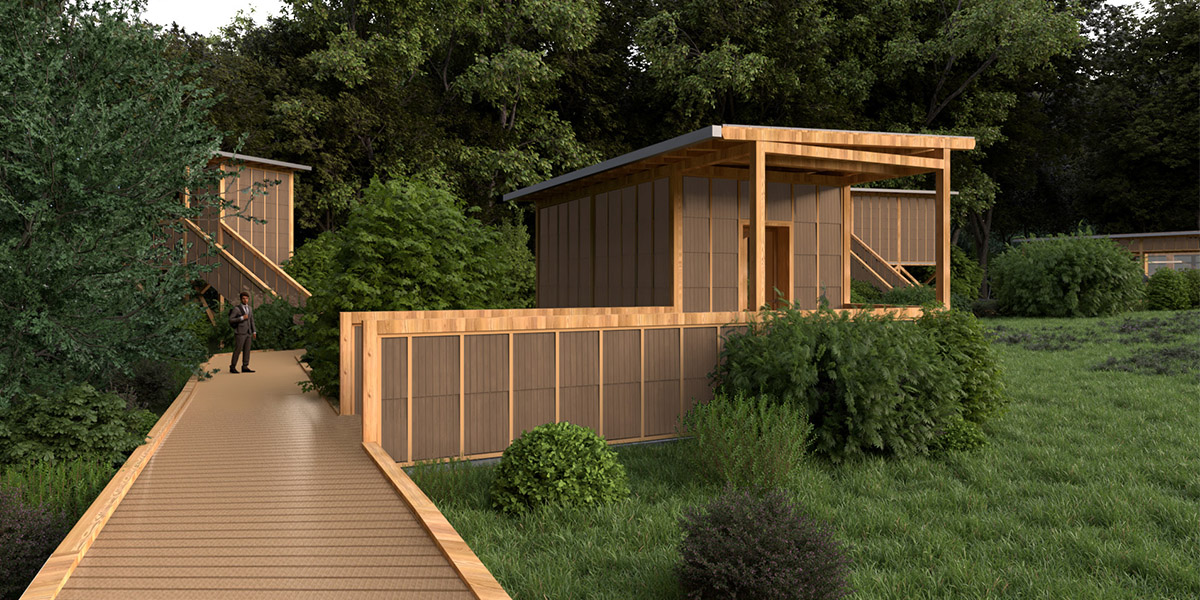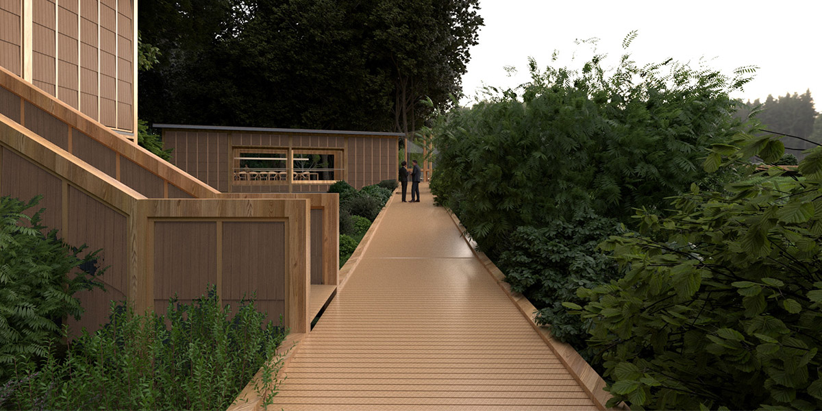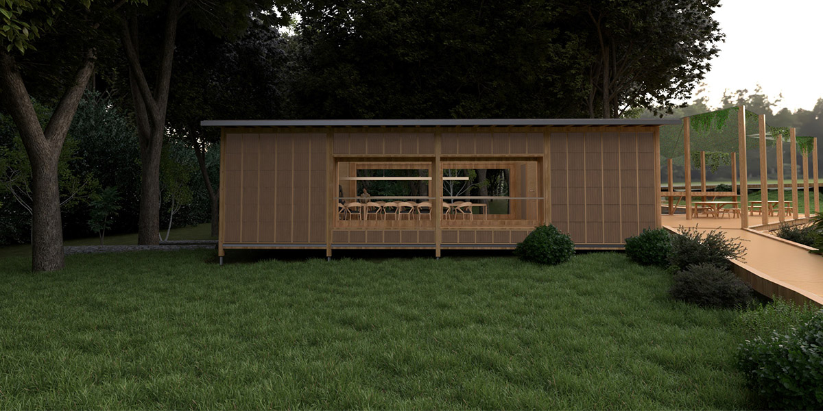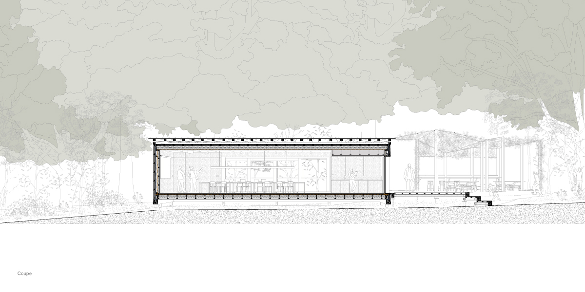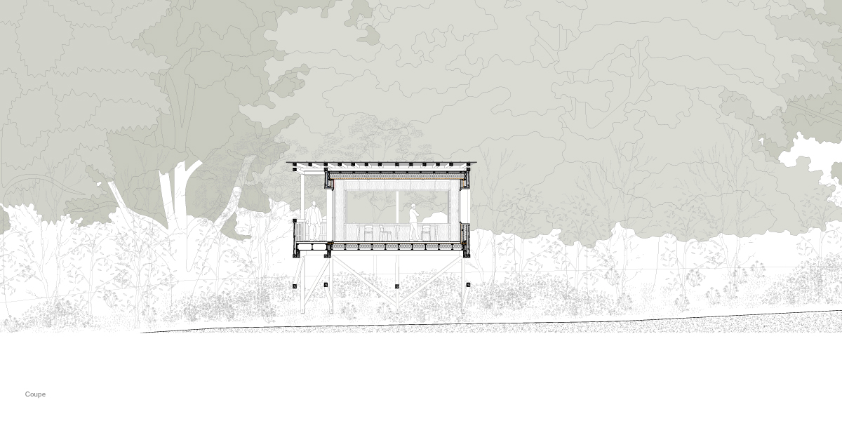 Dans ce paysage, quatre cabanes de travail viennent ponctuer et s’accrocher à ce ruban. Chaque cabane a été soigneusement placée et orientée de manière à préserver les habitats naturels et les corridors de biodiversité. Le travail en poteau poutre génère des cabanes très tramées, formant des modules qui se répètent. De simples lignes épurées des structures se marient harmonieusement avec le paysage environnant, créant ainsi une esthétique naturelle et intemporelle. Le projet est conçu pour répondre à des critères de préfabrication et de rapidité d’exécution afin d’éviter toutes nuisances aux espèces protégées habitants le site.