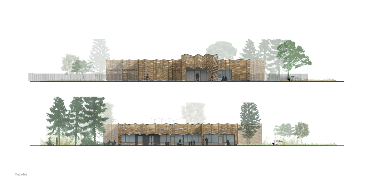 L’architecture de l’école existante est typique d’un certain fonctionnalisme des années 70. Les volumes s’assemblent dans une grande simplicité formelle, en simple rez-de-chaussée, avec des murs de refend venant diviser les espaces en zones fonctionnelles. La conception est bioclimatique, avec des orientations permettant de profiter des apports solaires hivernaux, et des apports de lumière en toiture.