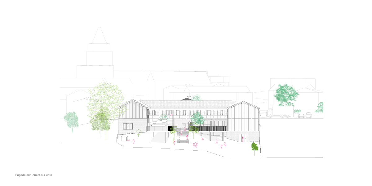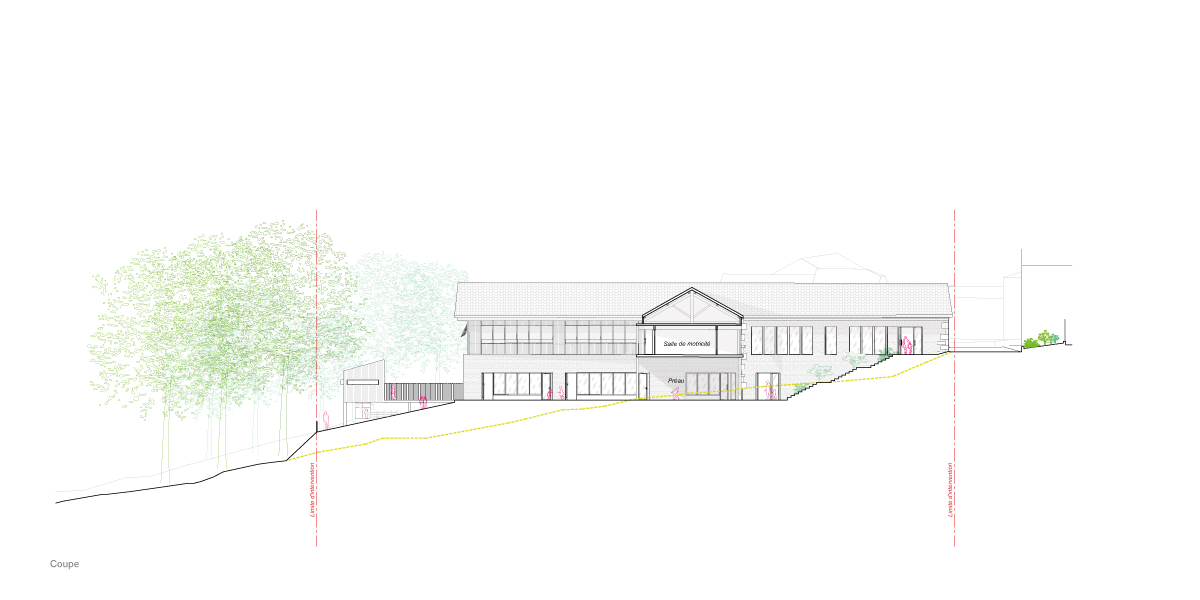 L’organisation du programme épouse la topographie et s’articule sur trois niveaux : le rez-de-chaussée, en lien avec la rue, accueille les espaces publics (hall, restaurant, motricité, administration), le niveau intermédiaire, en relation directe avec la cour, regroupe les salles de classe, et le niveau bas s’ouvre sur un grand espace paysager à vocation pédagogique. Ces strates successives créent un parcours fluide et cohérent entre l’école, la cour de récréation et la prairie éducative, favorisant les interactions entre les enfants et leur milieu.
