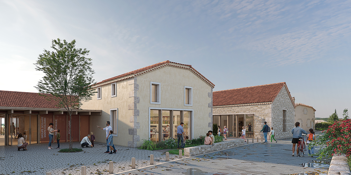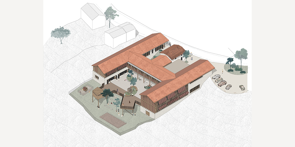 Le projet de création d’un Pôle Enfance à Sainte-Colombe-en-Bruilhois prend place sur le site de l’ancienne ferme Laborde. Il conjugue reconversion d’un patrimoine existant et construction neuve dans une approche attentive au relief naturel et à l’identité architecturale du village. Guidée par sa situation topographique, l’implantation du bâtiment s’inscrit dans la continuité du tissu bâti du village tout en valorisant les vues sur la vallée et le paysage rural.