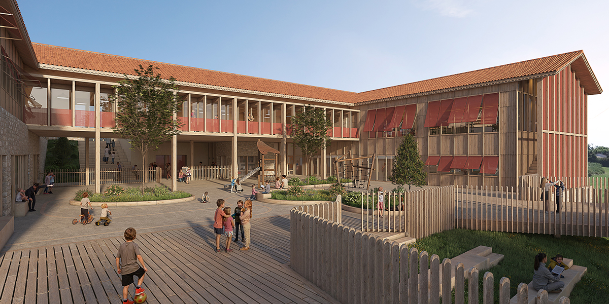 Le projet s’appuie sur un dialogue entre la pierre et le bois, entre ancrage et légèreté. Le soubassement en pierre relie le pôle enfance à l’identité constructive de la commune, tandis que le bois apporte chaleur et ouverture vers le paysage. L’usage de matériaux durables et locaux, associé à des volumes mesurés et à des toitures traditionnelles en tuiles canal, renforce l’intégration du bâtiment dans son environnement tout en affirmant son rôle d’équipement communal majeur.
