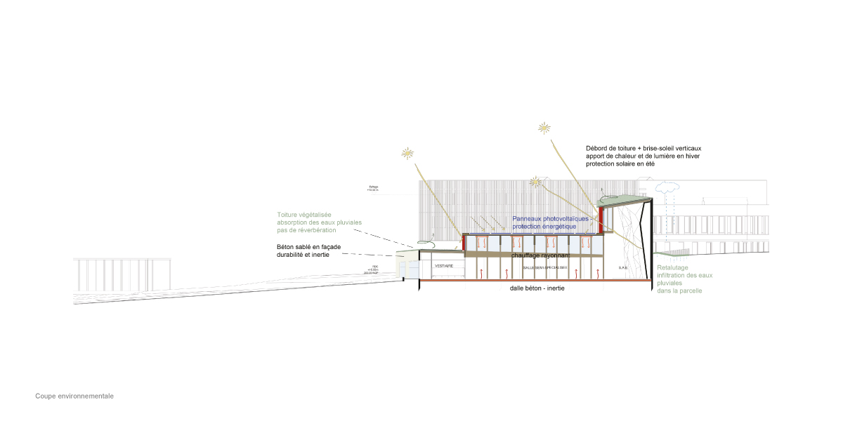 Le projet de mur d’escalade de Villefranche-de-Lauragais s’inscrit dans une démarche d’architecture bioclimatique attentive aux caractéristiques climatiques et paysagères du Lauragais. L’implantation du bâtiment a été pensée afin de tirer parti des ressources naturelles du site tout en garantissant un confort optimal aux usagers, qu’il s’agisse des sportifs, des spectateurs ou des participants aux manifestations et compétitions.