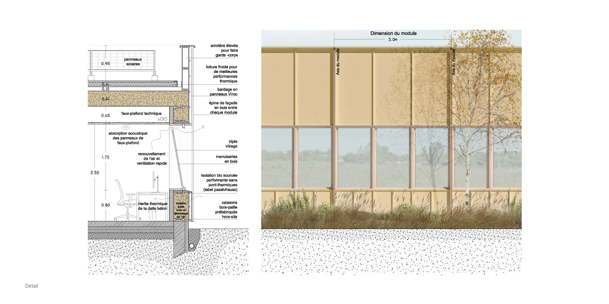 La trame constructive de 3 mètres structure l’ensemble : elle correspond aux éléments préfabriqués hors site, optimisés pour le transport et l’assemblage. Les ouvertures, calées sur cette trame, déclinent les usages : Baies latérales pour la salle du conseil, ouvertes sur le paysage et symboles de transparence publique ; Fenêtres en bandeaux pour les bureaux, favorisant la lumière naturelle au poste de travail ; Éclairements en partie haute pour l’atelier, permettant le rangement latéral et la diffusion homogène de la lumière.