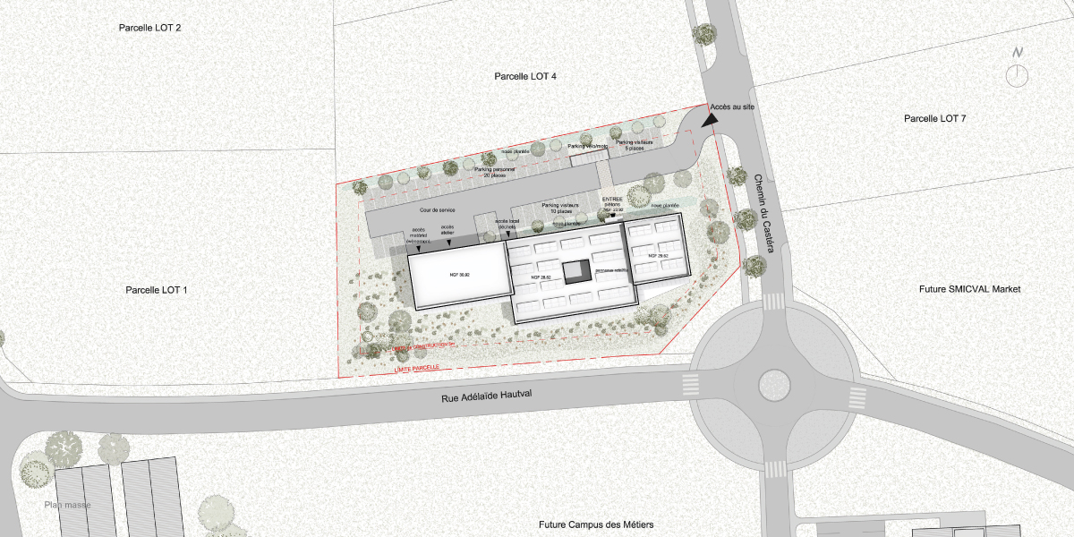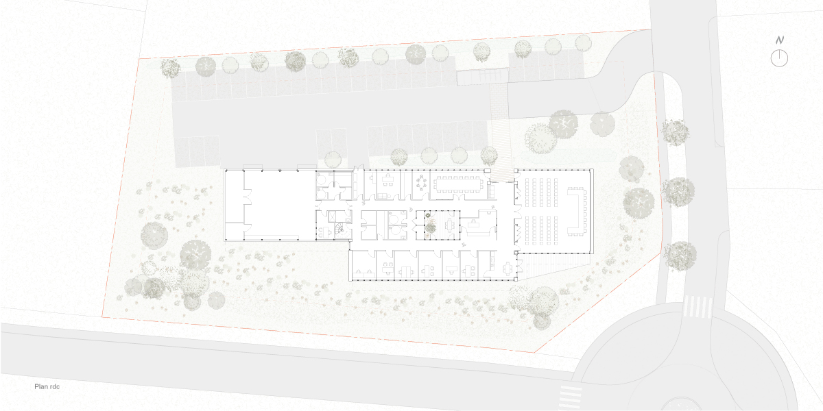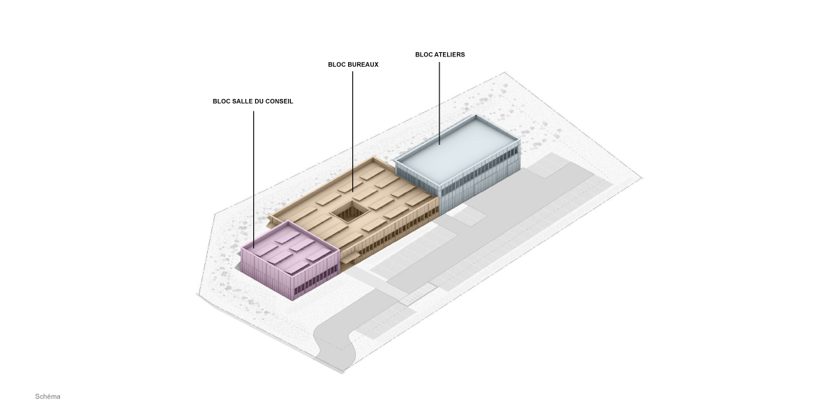 L’édifice s’organise selon un axe est-ouest, le long de la rue Adélaïde Hautval. En léger retrait de la voirie, le bâtiment s’élève derrière une bande végétale qui lui offre une assise naturelle et met à distance l’espace public. Le parking, relégué au nord le long de la limite parcellaire, dégage ainsi la façade principale pour une lecture claire et apaisée du projet. Cette implantation optimise les surfaces extérieures grâce à une unique voie assurant les accès de service et de stationnement. L’architecture se distingue par une volumétrie épurée et lisible, composée de trois blocs aux hauteurs différenciées : À l’est, un volume légèrement plus haut abrite la salle du conseil ; Au centre, un volume accueillant les bureaux s’organise autour d’un patio lumineux, véritable cœur calme et végétal du projet ; À l’ouest, un volume plus généreux reçoit l’atelier technique. Ces trois entités expriment clairement les fonctions majeures du programme tout en permettant un fonctionnement indépendant ou coordonné des espaces.