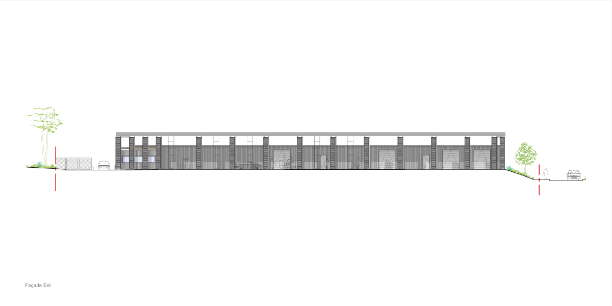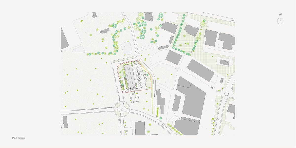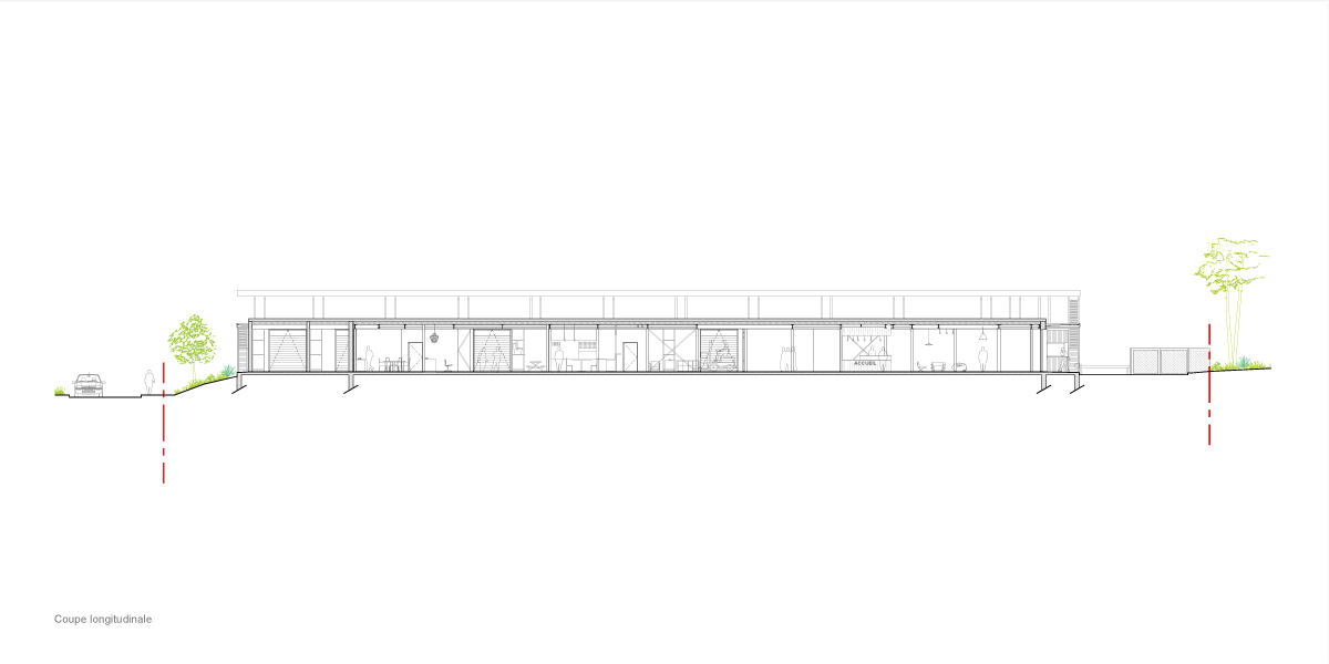 Le projet s’implante sur le site avec un volume rectangulaire simple, proposant une façade urbaine, une vitrine côté Ouest, et une façade plus fonctionnelle cotée Est, suivant ainsi les logiques d’implantations urbaines déjà à l’œuvre sur le site. Cette implantation permet une gestion simple des différents flux tout en utilisant les accès déjà définis au permis d’aménager. Les flux usagers, publics et personnels sont concentrés côté Ouest, et les flux liés à la gestion des déchets et la logistique côté Est, sans qu’ils ne se croisent. À partir de l’implantation définie, le projet se décompose en deux volumes parallèles permettant d’accueillir toutes les entités du programme : Un volume clos et couvert pour les espaces intérieurs, et un volume de préau pour les stockages. L’aménagement des espaces est simple et pensé comme un plateau libre d’espaces capables, facilitant l’aménagement intérieur de La maison des objets et permettant des évolutions futures. Les locaux du personnel sont stratégiquement placés au centre du bâtiment pour faciliter le travail des agents.