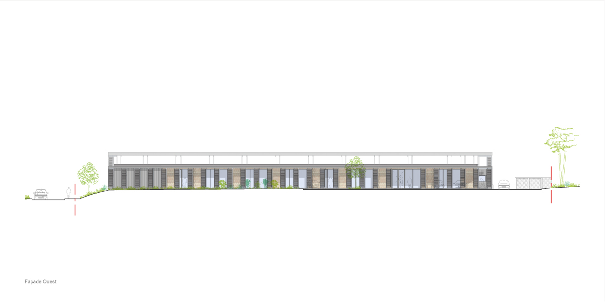L’écriture architecturale du projet se résume par une volumétrie simple, marquée par les toitures horizontales. Le décollement de la toiture du préau amène un sentiment de légèreté et une transparence avec le paysage. La perception globale du projet est celle d’un objet « abstrait », homogène, caractérisé par son péristyle de persiennes qui mettent en avant les matériaux de réemploi.