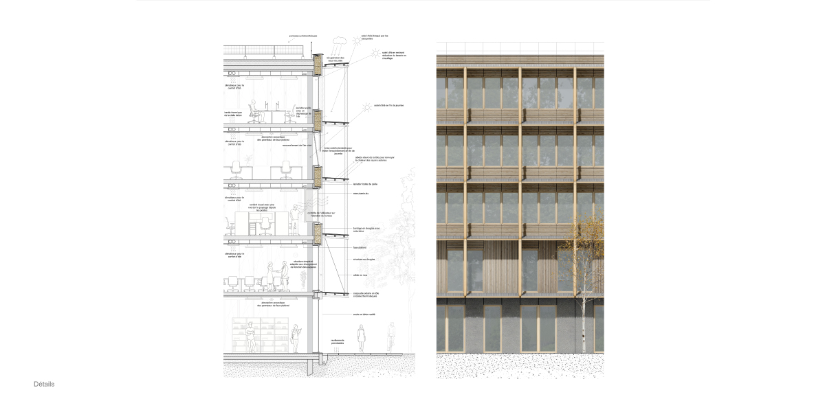 matériaux Structure poteau-poutre en béton, façade ossature bois isolée en paille, bardage bois extérieur et casquette solaire en tôle ondulée métallique