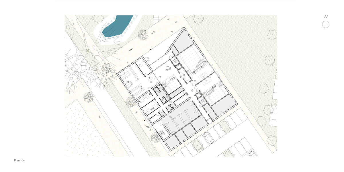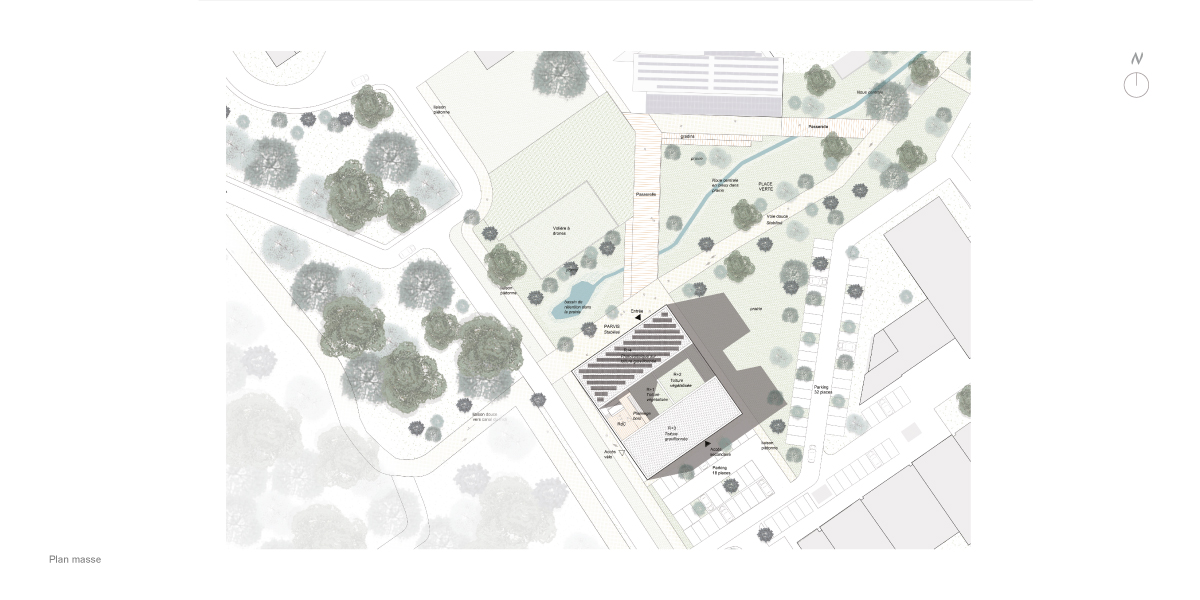 Le bâtiment s’accroche à cette trame verte principale et se développe en R+4, dans un volume compact. Les espaces communs sont répartis dans un socle situé en RDC et R+1, tandis que les espaces de bureaux prennent place dans les étages dans les ailes supérieures. Ces deux ailes sont reliées par une faille constituée de passerelles / terrasses permettant d’optimiser l’apport en lumière naturelle des bureaux et les circulations.